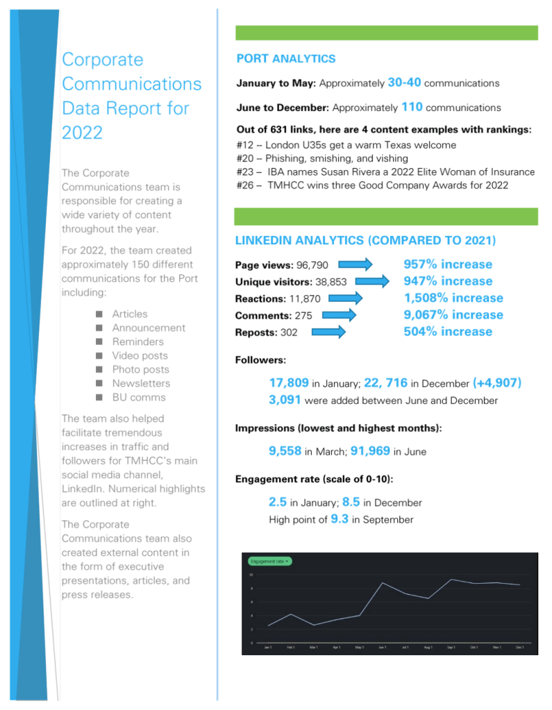 DATA ANALYSIS AND REPORTS: I am very adept at using numbers to quantify project (and work) success. Whether it’s using analytics to show year-over-year increases in traffic to a website or social media channel, or compiling an annual report to track work production in quantifiable terms — numbers can add depth to whatever story I’m trying to tell.